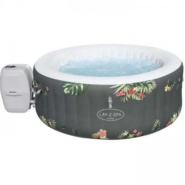 Spa gonflable rond Lay-Z-Spa Aruba Airjet™ : - 170 x 66 cm - 2 à 3 personnes - Design extérieur tropical et imprimé mosaïque sur le fond - Volume d'eau à 80% : 605 L - Poids en eau : 630 kg - Diamètre intérieur : 124 cm - Parois en Duraplus™ - 110 Airjet™ - Pompe avec panneau de contrôle digital relevable - Système antigel Freezeshield™ Contient une couverture isolante, une cartouche et un diffuseur